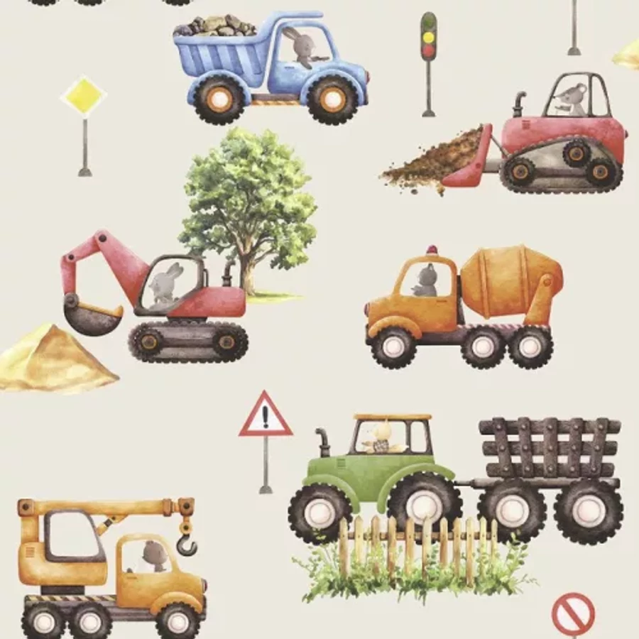 Bézs alapon színes munkagépes tapéta