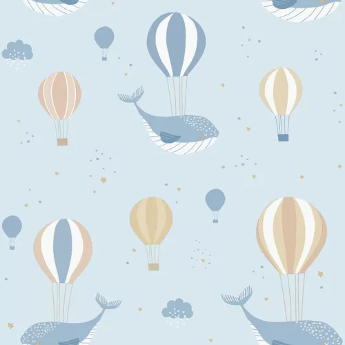 Kék alapon barna léghajós kék bálnás tapéta